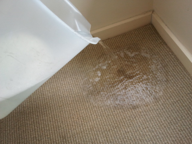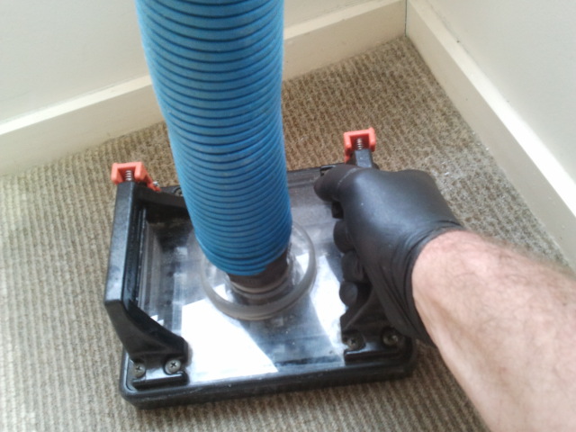 Animal urine is a complex issue. Some people prefer to ‘throw a bit of deodoriser at it’ and hope nobody notices it. This may cut it in cases of small contaminations, but to really stop the urine from causing further damage, the area needs to be flooded with a urine neutralising solution, then flushed continuously to remove the odour emitting contaminants using a water claw and our truck mounted extraction machine (see the pics below). This will ensure that the stain or colour loss won’t get any worse, and the smell will be neutralised at the same time. Usually it pays to remove the affected areas of underlay and replace as well.